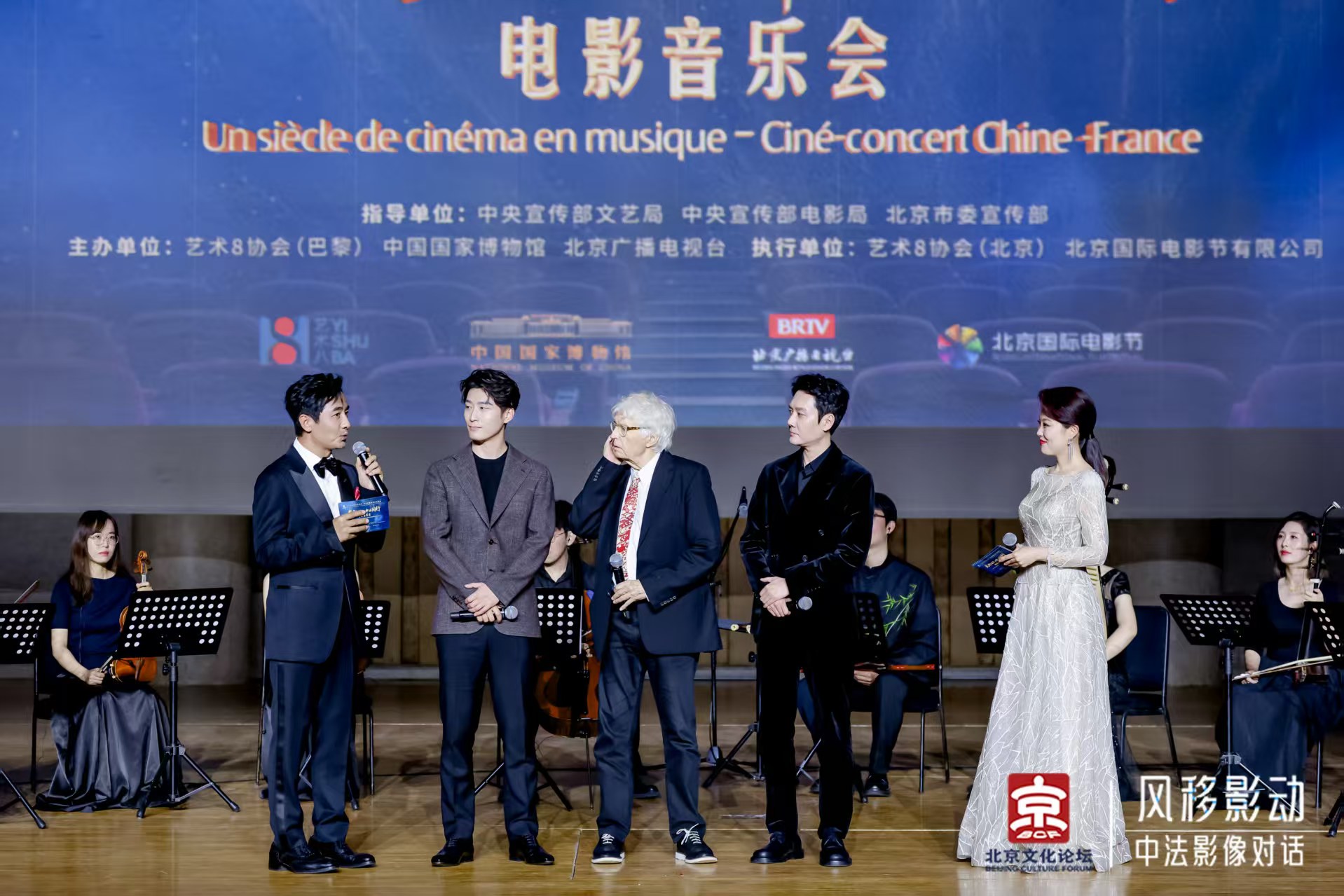 片子《狼图腾》导演让-雅克·阿诺(中)与演员冯绍峰(右二)、窦骁(左二)在音乐会上互动。蛮交