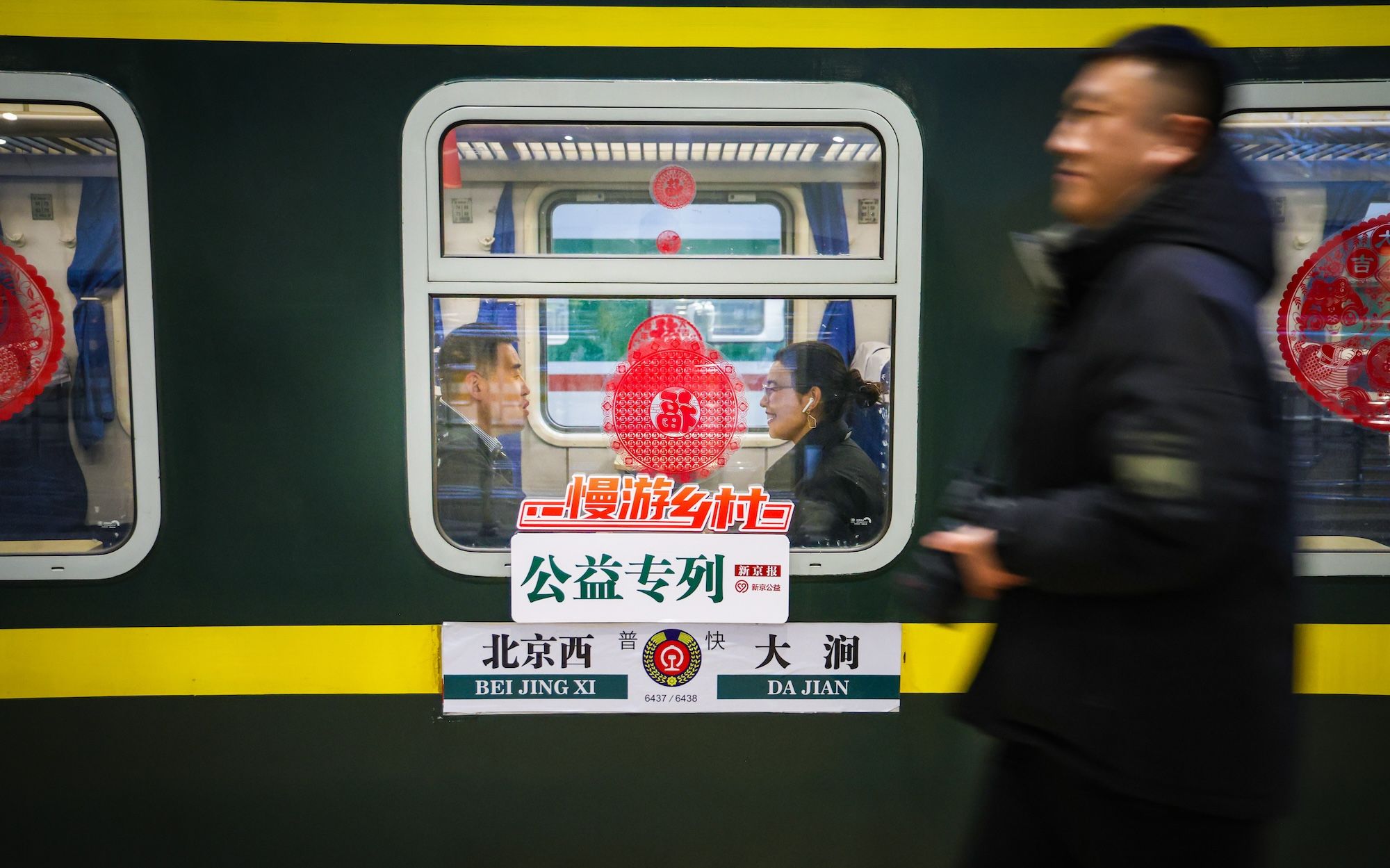 6437北京西至大涧公益专列,车窗上贴着新春窗花拆穿。
